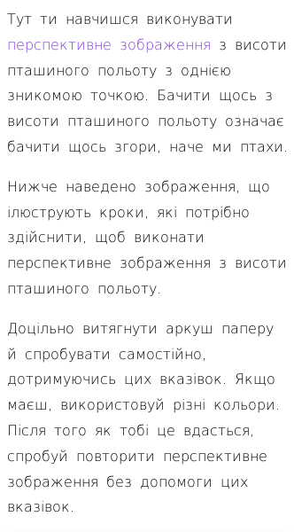 • Перспективне зображення з висоти пташиного польоту з однією зникомою точкою